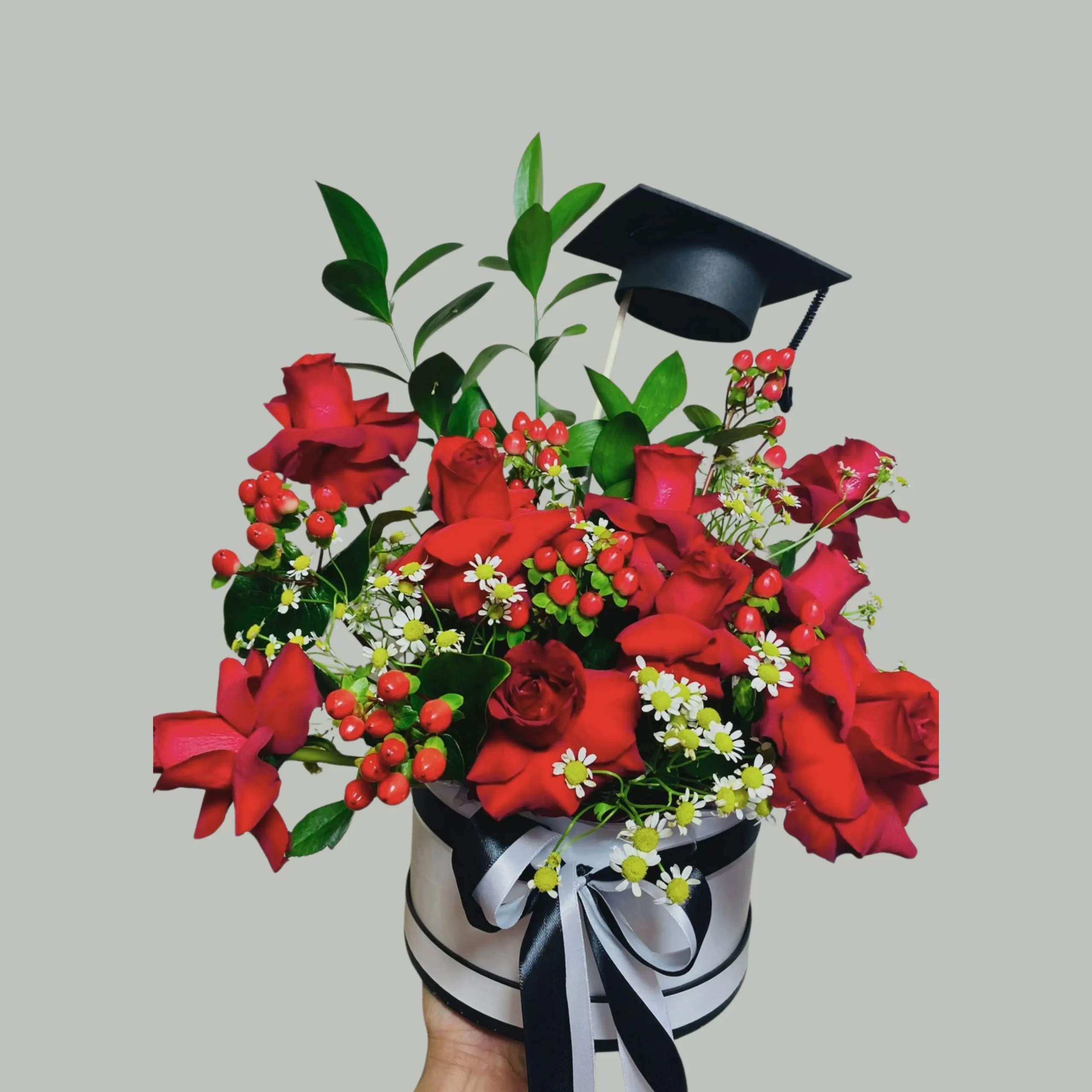 + Free ShippingThis beautiful graduation arrangement features red roses and hypericums, chamomile flowers and a touch of ruscus and of course the graduation hat topper all set on beautiful round container
