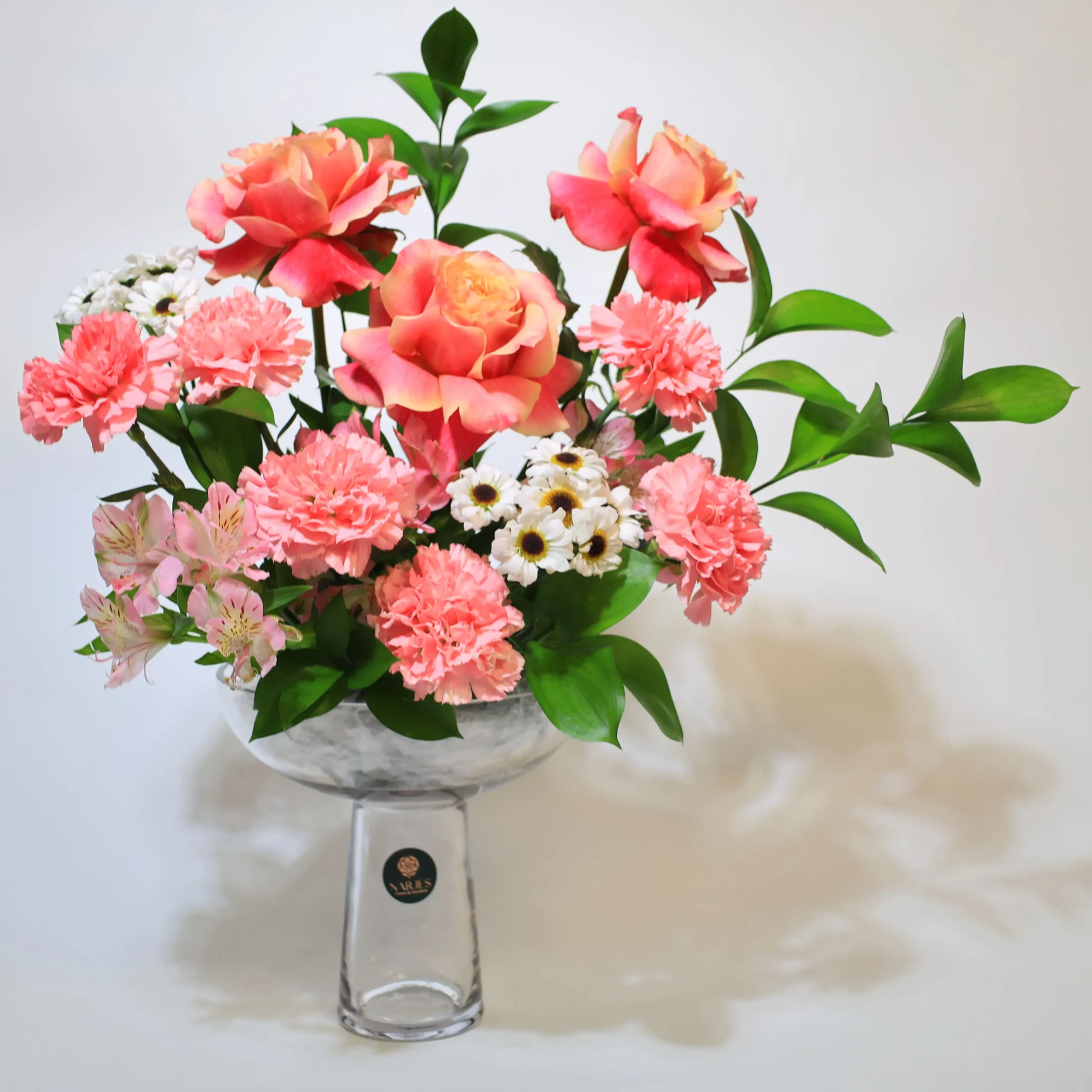 + Free ShippingThis arrangement has pink roses, carnations, alstroemeria, white spray chrysanthemum, with a touch of ruscus leave arranged nicely in the round glass vase.