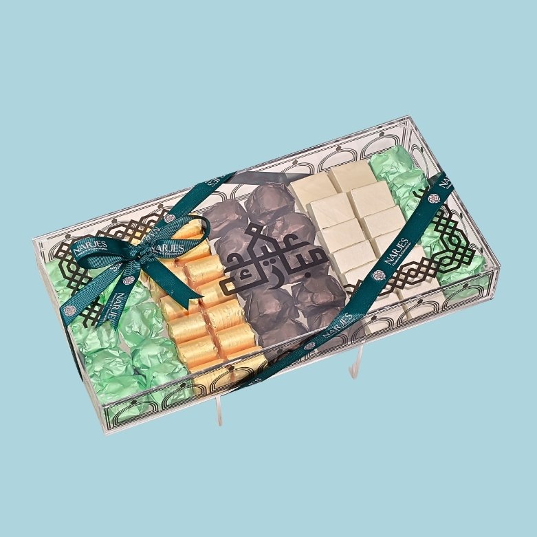This beautiful Eid Mubarak rectangular acrylic box containing assorted Belgian chocolates, tied nicely with our signature ribbon.