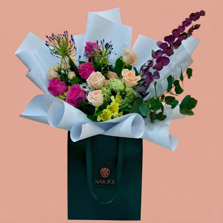 + Free ShippingThis beautiful graduation bouquet features fucia roses, peach roses, blue agapanthus, yellow alstroemeria, white trachelium, soft pink spray roses, and a touch of pink and Normal eucalyptus.