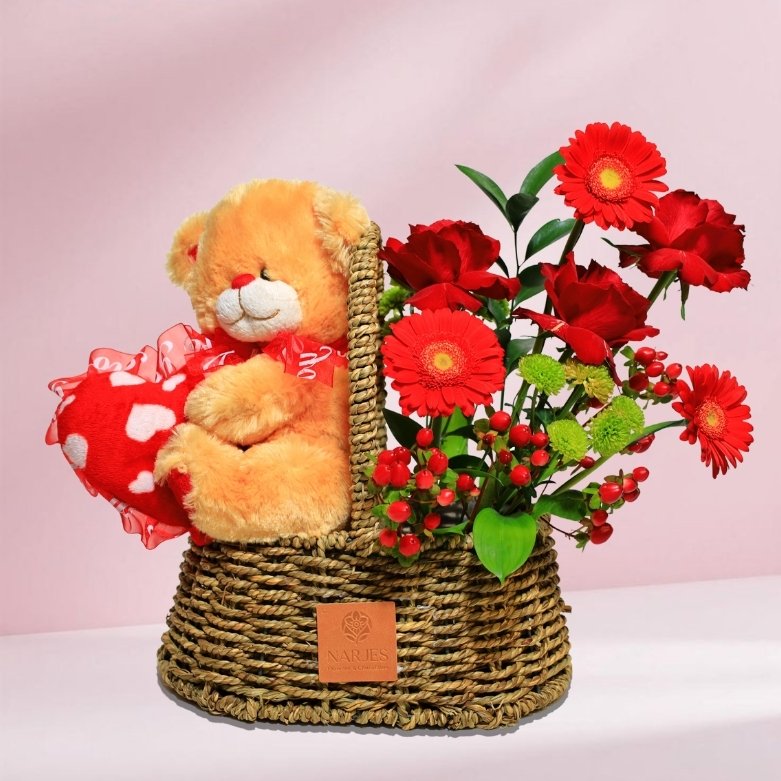 Teddy Love Basket – Red Roses, Gerberas & Hypericum Arrangement