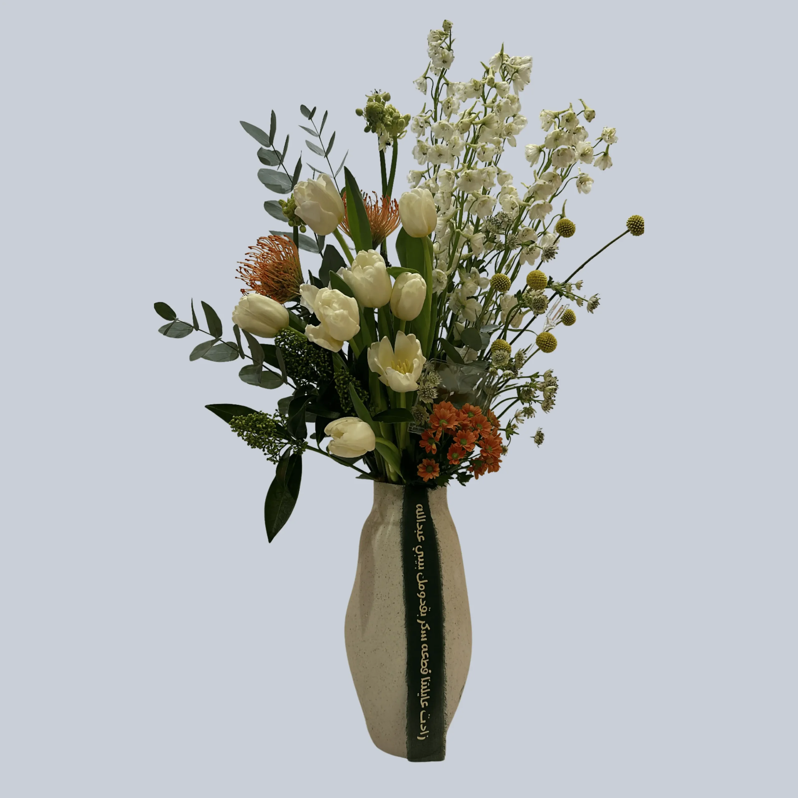 + Free ShippingThis beautiful arrangement features white delphinium, white tulips, orange pincushions, yellow craspedia, orange spray chrysanthemum, white Arab eye flowers, with a touch of eucalyptus and white astrantia star flowers.